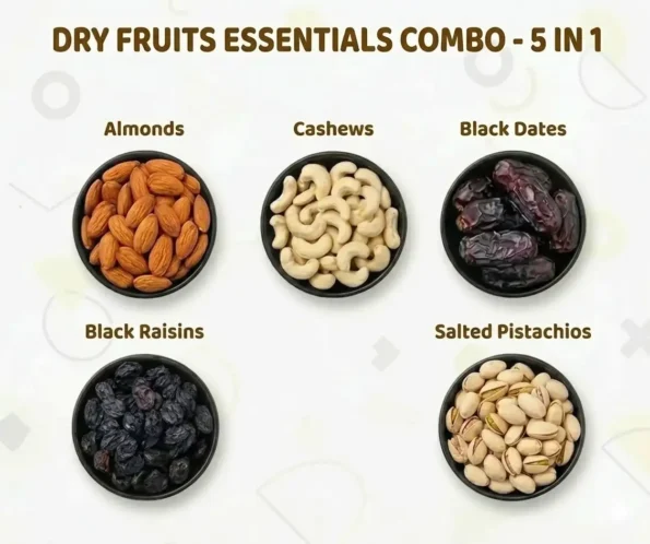 Experience the perfect balance of taste, nutrition, and value with our Premium Dry Fruits Essentials Combo 5 in 1. This combo includes carefully selected high-quality nuts and dried fruits, packed in generous portions—ideal for families and daily consumption.