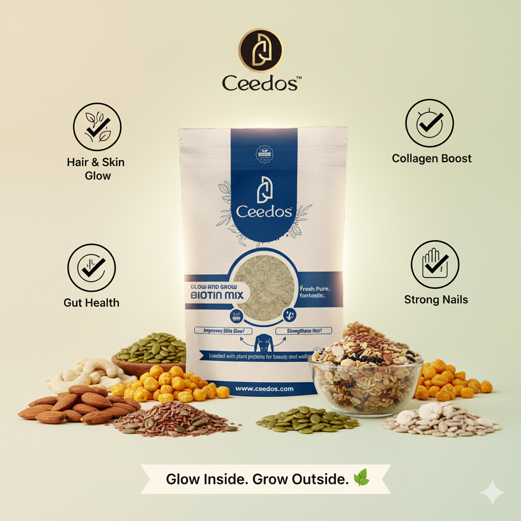 Ceedos Glow & Grow Biotin Health Mix is a premium sugar-free blend of makhana, almonds, cashews, pumpkin seeds, flax seeds, sunflower seeds, and roasted channa. Rich in natural biotin, protein, fiber, and healthy fats, this daily nutrition mix supports healthy hair growth, glowing skin, and improved digestion. Ideal for all age groups, with no grains, fillers, or added sugar.